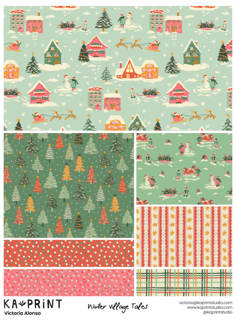 Winter Village Tales is a cozy holiday collection featuring a whimsical snowy village with storybook houses, evergreen trees, sleigh rides, snowmen, and reindeer wandering through gentle snowfall. The hero print captures the full winter scene, supported by coordinating designs including a festive tree pattern, playful village vignettes, and versatile blenders like confetti snow, sweet stripes, and a classic seasonal plaid. Perfect for Christmas fabrics, kids bedding, pajamas, gift wrap, stationery, wallpaper, and warm winter home décor. Available for licensing.